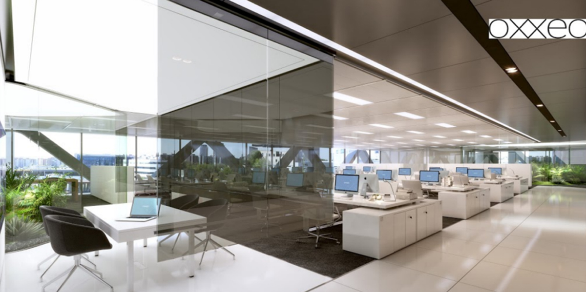 OXXEO is the first office building in Spain to deploy a dynamic lighting system that helps synchronizing the circadian rhythm of the people to the daylight cycle. The building holds Platinum LEED and Well certifications, with a special focus on the lighting.