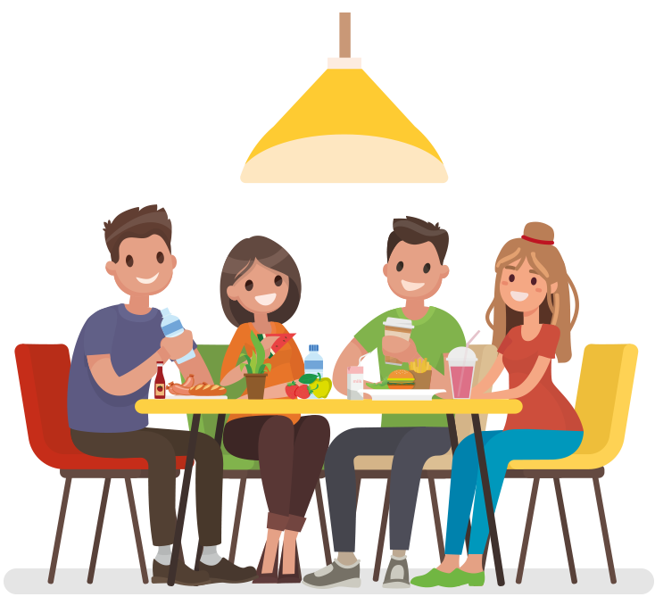 Emma and her friends enjoy lunch in the school cafeteria, where the warm light creates a calm and restful atmosphere.